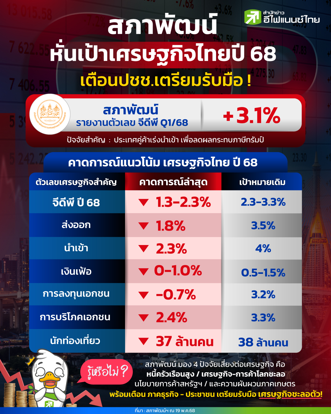 สำนักงานสภาพัฒนาการเศรษฐกิจและสังคมแห่งชาติ (สศช.) ประเมินแนวโน้มเศรษฐกิจไทยปี 68 ว่าจะชะลอตัวลงจากปีก่อน โดยปรับลดคาดการณ์จีดีพีเหลือโตเพียง 1.3-2.3% มีค่ากลางที่ 1.8% จากเดิมคาดไว้ที่ 2.3-3.3% เนื่องจากแรงกดดันจากมาตรการกีดกันทางการค้าของสหรัฐ โดยเฉพาะการขึ้นภาษีนำเข้าสินค้าจากไทย ซึ่งจะเริ่มส่งผลชัดเจนในช่วงครึ่งหลังของปี สศช.เตือนว่า เศรษฐกิจไทยยังต้องเผชิญกับปัจจัยเสี่ยงสำคัญหลายประการ ทั้งภาระหนี้ครัวเรือนที่ยังสูง แนวโน้มการชะลอตัวของเศรษฐกิจโลก รวมถึงความไม่แน่นอนจากทิศทางนโยบายการเงินของประเทศมหาอำนาจ