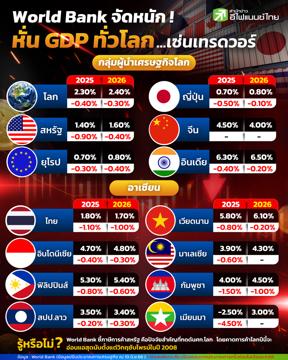 ธนาคารโลก (World Bank) ประกาศปรับลด คาดการณ์ GDP โลก ปี 2568 ลงอย่างมีนัยสำคัญในรายงานล่าสุดประจำวันที่ 10 มิถุนายน 2568 เทียบกับประมาณการครั้งก่อนเมื่อเดือนมกราคมที่ผ่านมา สะท้อนผลกระทบจาก สงครามการค้าระหว่างสหรัฐฯ และ จีน ที่ยังคงยืดเยื้อ และ ส่งแรงกระแทกต่อเศรษฐกิจโลกอย่างต่อเนื่อง ประเทศมหาอำนาจอย่าง สหรัฐอเมริกา , สหภาพยุโรป , ญี่ปุ่น , อินเดีย และ จีน ต่างถูกหั่นคาดการณ์ GDP ปี 2568 ลดลงทั้งหมด ซึ่งตอกย้ำถึงความเปราะบางของระบบเศรษฐกิจโลกในปัจจุบัน ขณะเดียวกัน เศรษฐกิจอาเซียน ก็เผชิญแรงกดดันไม่แพ้กัน