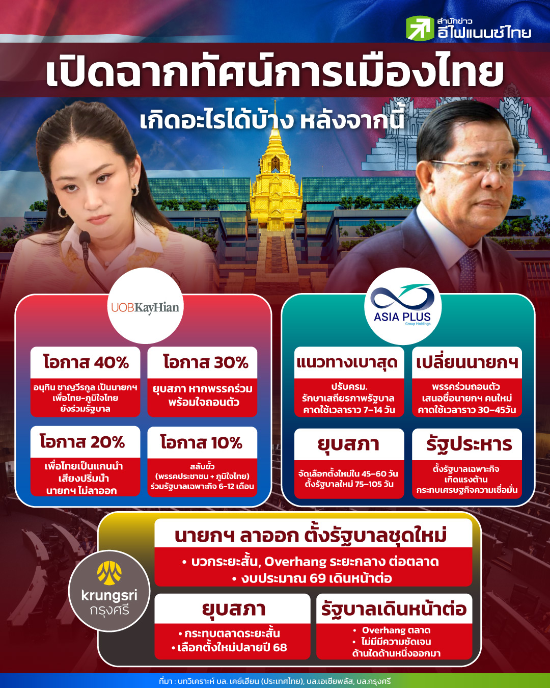 ท่ามกลางความไม่แน่นอนทางการเมืองที่กลับมาร้อนแรงอีกครั้งจากกรณี "คลิปเสียง" ซึ่งถูกมองว่าอาจสั่นคลอนเสถียรภาพของรัฐบาล โดยมุมมองของนักวิเคราะห์ประเมินสถานการณ์อาจนำไปสู่ได้หลายฉากทัศน์ ตั้งแต่การปรับคณะรัฐมนตรี การเปลี่ยนตัวนายกฯ ไปจนถึงทางออกที่รุนแรงที่สุดอย่าง "การยุบสภา" ซึ่งจะนำไปสู่การเลือกตั้งใหม่ สำนักข่าว "อีไฟแนนซ์ไทย" จึงได้รวบรวมมุมมองฉากทัศน์การเมืองไทย จากนักวิเคระห์ 3 โบรก ได้แก่ บล. เคย์เฮียน (ประเทศไทย), บล.เอเซียพลัส และ บล.กรุงศรี ว่าจะเกิดอะไรได้บ้าง