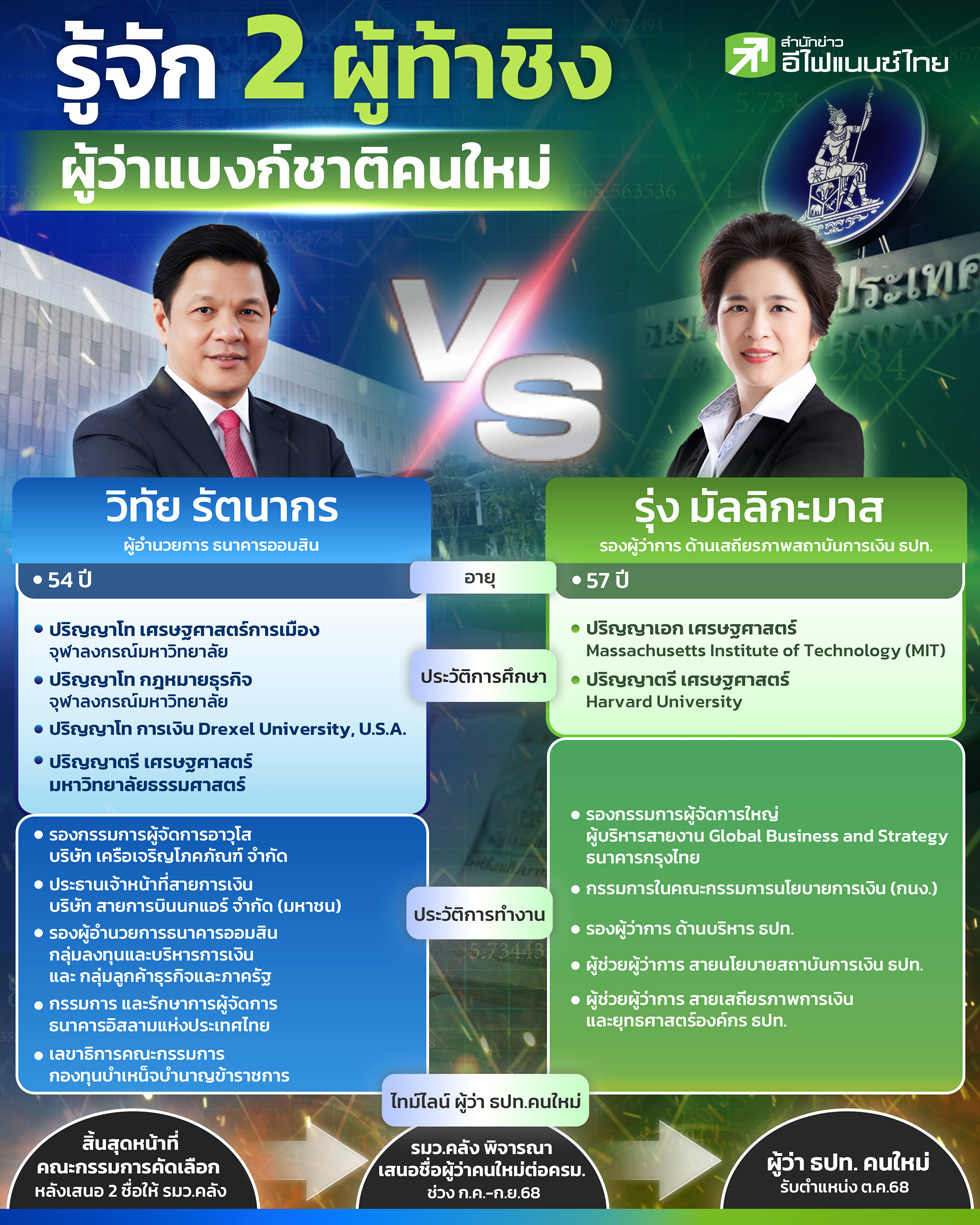 การเปลี่ยนผ่านตำแหน่งผู้ว่าการธนาคารแห่งประเทศไทย (ธปท.) กำลังอยู่ในความสนใจของทั้งวงการเศรษฐกิจและการเงิน โดย ดร.เศรษฐพุฒิ สุทธิวาทนฤพุฒิ ผู้ว่าการ ธปท. คนปัจจุบัน จะครบวาระในวันที่ 30 กันยายน 2568 ล่าสุด มีผู้สมัครเข้ารับการคัดเลือกจำนวน 6 ราย และ ได้แสดงวิสัยทัศน์ต่อคณะกรรมการคัดเลือกไปเมื่อวันที่ 24 มิถุนายน 2568 จนได้ 2 ผู้ผ่านเข้ารอบสุดท้าย ซึ่งหนึ่งในนี้จะได้รับการเสนอชื่อเป็นผู้ว่าการ ธปท. คนที่ 22 ได้แก่ : 1. ดร.รุ่ง มัลลิกะมาส รองผู้ว่าการด้านเสถียรภาพสถาบันการเงิน ธปท. มีบทบาทสำคัญในการกำกับดูแลระบบธนาคารพาณิชย์