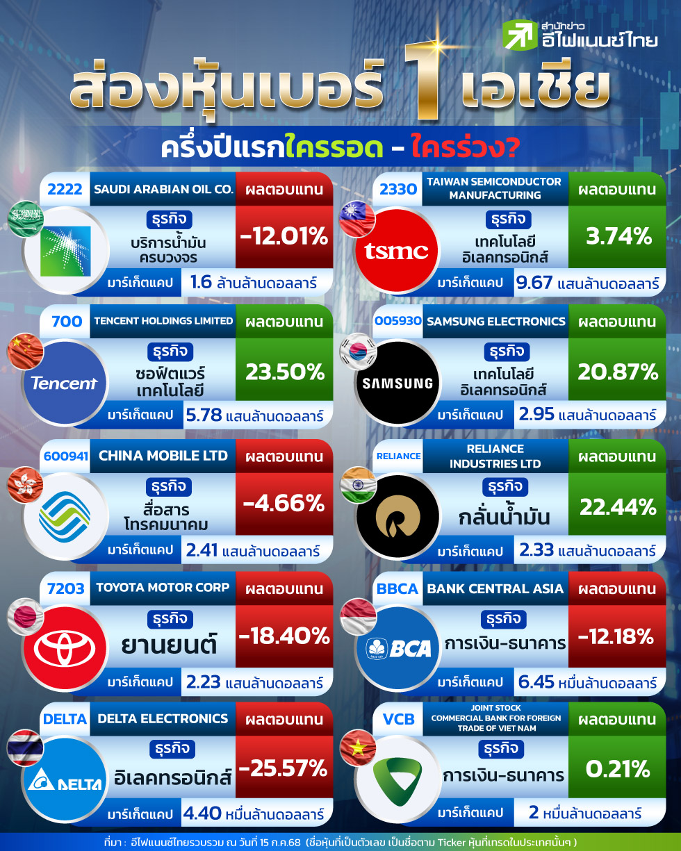 ครึ่งแรกปี 68 ตลาดหุ้นเอเชียมีความผันผวนอย่างต่อเนื่อง ท่ามกลางแรงกดดันเศรษฐกิจโลก ทำให้ผลตอบแทนของหุ้นเบอร์ 1 ในแต่ละประเทศต่างมีภาพรวมที่หลากหลาย บางรายฟื้นตัวขณะที่บางรายเผชิญแรงขายกดดันผลตอบแทนติดลบ ซึ่งหากวัดกันภายใน 10 ตลาดหุ้นในโซนเอเชียที่สำคัญๆ ส่วนใหญ่หุ้นในกลุ่มเทคโนโลยียังเป็นพระเอกในภูมิภาคนี้ เช่น Tencent, Samsung Electronics และ TSMC ยังคงได้รับผลตอบแทนสูงจากกระแส AI และความต้องการชิปที่ยังแข็งแกร่ง ตอบรับการเปลี่ยนผ่านสู่โลกดิจิทัล ด้านกลุ่มน้ำมันเริ่มฟื้นตัวในบางประเทศที่บริหารต้นทุนดีและขยายธุรกิจใหม่