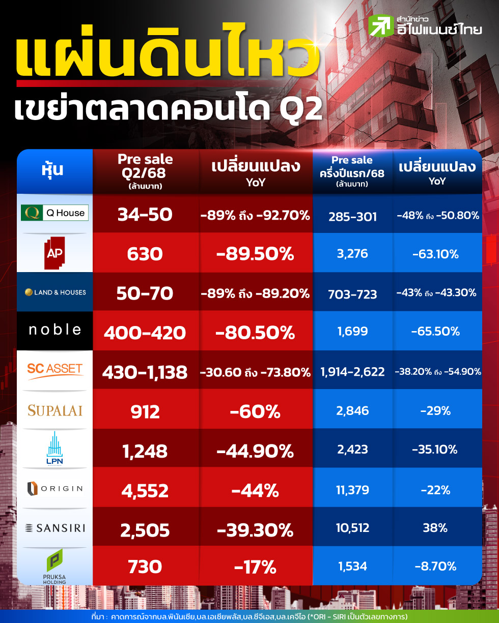เหตุการณ์แผ่นดินไหวเมื่อวันที่ 28 มี.ค. ที่ผ่านมา สร้างผลกระทบต่อความเชื่อมั่นของผู้บริโภค รวมถึงความกังวลในด้านชีวิตและความปลอดภัยของประชาชนอยู่ไม่น้อย โดยเฉพาะกับตลาดคอนโดมิเนียม ที่รับผลกระทบโดยตรง ทำให้ยอดขาย (Presale) ในช่วงไตรมาส 2/68 ของบรรดาผู้ประกอบการอสังหาริมทรัพย์ติดลบกันถ้วนหน้า โดย “สำนักข่าวอีไฟแนนซ์ไทย” ได้ทำการรวบรวมยอด Presale ของคอนโดมิเนียม ในไตรมาส 2/68 และครึ่งปีแรกมาให้นักลงทุนได้รับทราบกันว่าลดลงมากน้อยแค่ไหน เมื่อต้องรับรู้กับปัจจัยลบที่ไม่คาดคิดอย่างแผ่นดินไหวแบบเต็มไตรมาส