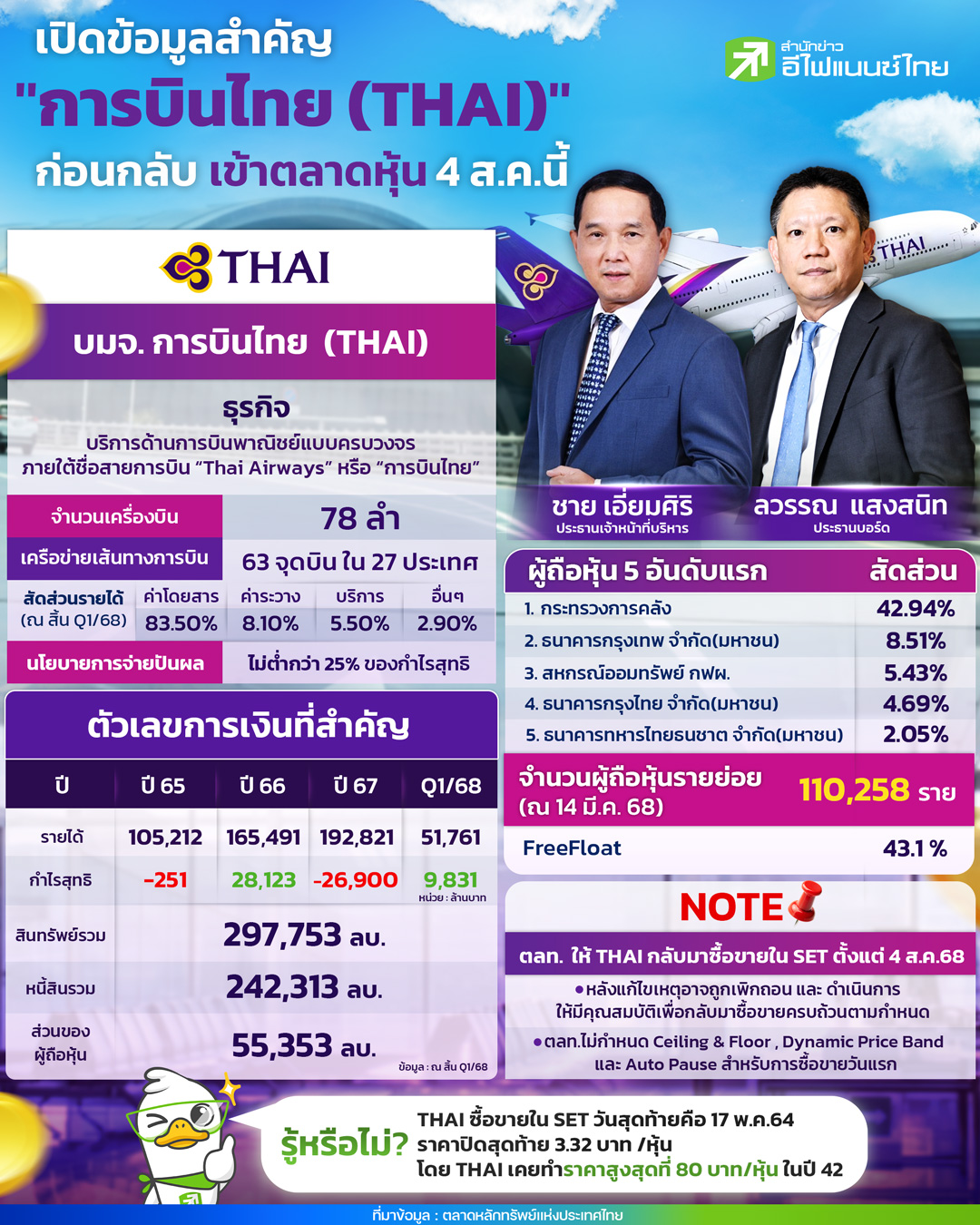 เปิดข้อมูลสำคัญ "การบินไทย(THAI)" ก่อนกลับเข้าตลาดหุ้น 4 ส.ค. นี้