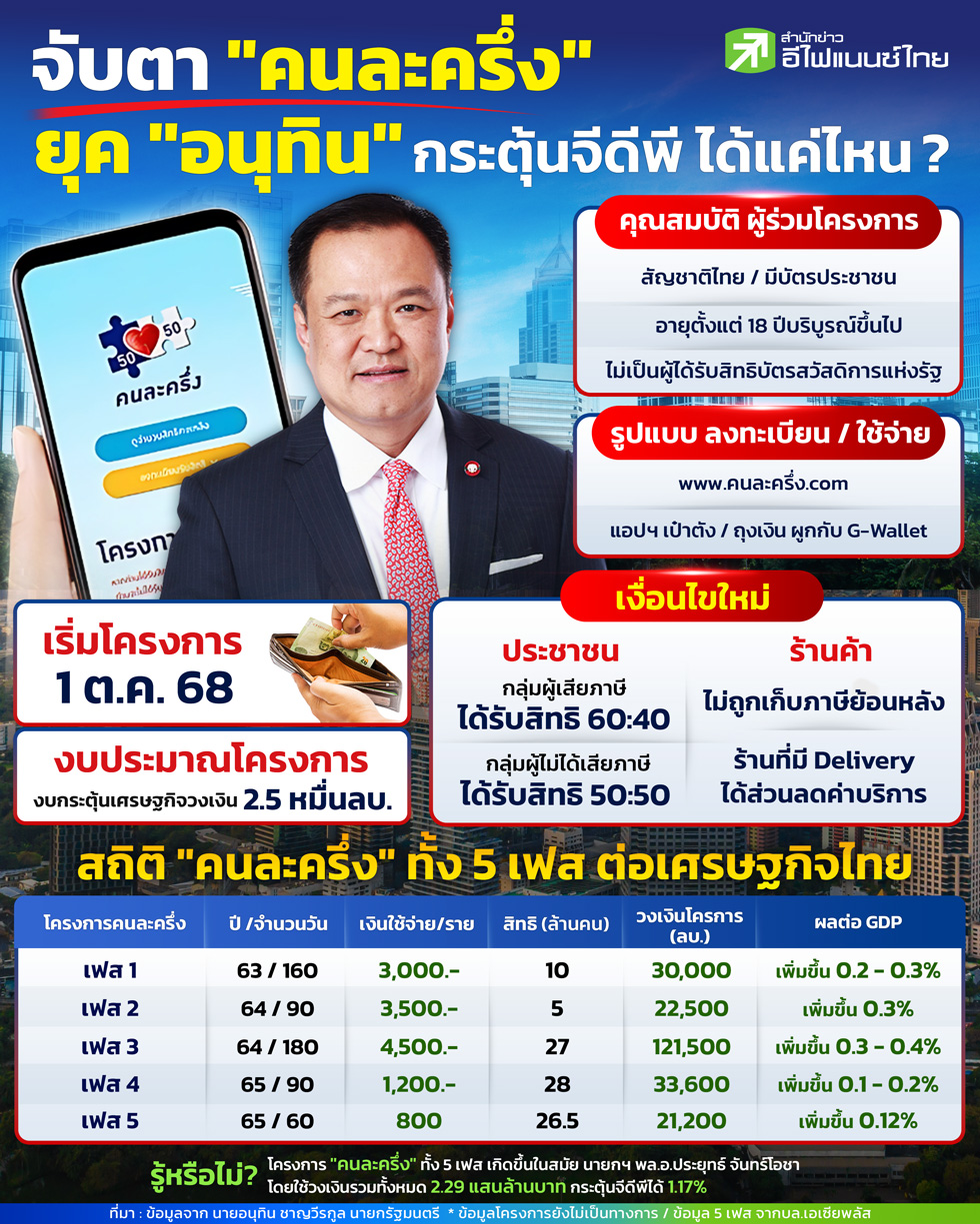 "คนละครึ่ง" เป็นมาตรการที่หลายคนรู้จัก และ ได้รับความนิยมเป็นอย่างมาก เนื่องจากได้ช่วยประชาชนลดค่าครองชีพ และ ยังเป็นการกระตุ้นกำลังซื้อด้านอุปโภคบริโภคภายในประเทศได้ และ ล่าสุด "รัฐบาลอนุทิน" เตรียมนำมาตรการนี้กลับมาอีกครั้ง สำหรับรายละเอียดของโครงการ "คนละครึ่ง" แม้ว่าจะยังไม่ออกมาอย่างเป็นทาง แต่ทาง นายลวรณ แสงสนิท ปลัดกระทรวงการคลัง ได้ออกมายืนยันแล้วว่า ระบบการใช้จ่ายผ่านแอปพลิเคชัน "เป๋าตัง" ที่ทุกคนคุ้ยเคยกันดี และมีความพร้อมสมบูรณ์ และพร้อมที่รองรับโครงการได้ทันทีหากมีการอนุมัติออกมาอย่างเป็นทางการ