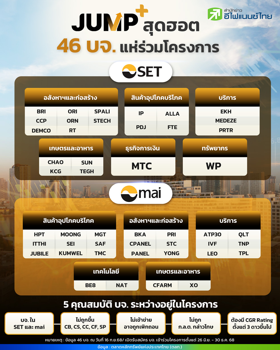 ปัจจุบันโครงการส่งเสริมการเพิ่มมูลค่าให้กับบริษัทจดทะเบียน (JUMP+) เพื่อสร้างความเชื่อมั่นในตลาดทุนไทยที่ริเริ่มโดยตลาดหลักทรัพย์แห่งประเทศไทย (ตลท.) ถือว่าประสบความสำเร็จในระดับหนึ่ง ภายหลังจากมีบริษัทจดทะเบียนไทย (บจ.) ให้ความสนใจและตบเท้าเข้าร่วมโครงการกันอย่างคึกคัก โดยล่าสุด ( 16 ก.ย.68) พบว่ามียอด บจ.สมัครเข้าร่วมโครงการแล้วรวมจำนวนกว่า 46 บริษัท ซึ่งถือว่าเข้าใกล้เป้าหมายที่ ตลท.ตั้งเป้าหมายไว้ระดับ 50 บริษัท ทั้งนี้ "สำนักข่าวอีไฟแนนซ์ไทย" รวบรวมข้อมูลจากทั้ง 46 บจ. พบว่าเป็นบริษัทในตลาดหลักทรัพย์แห่งประเทศไทย