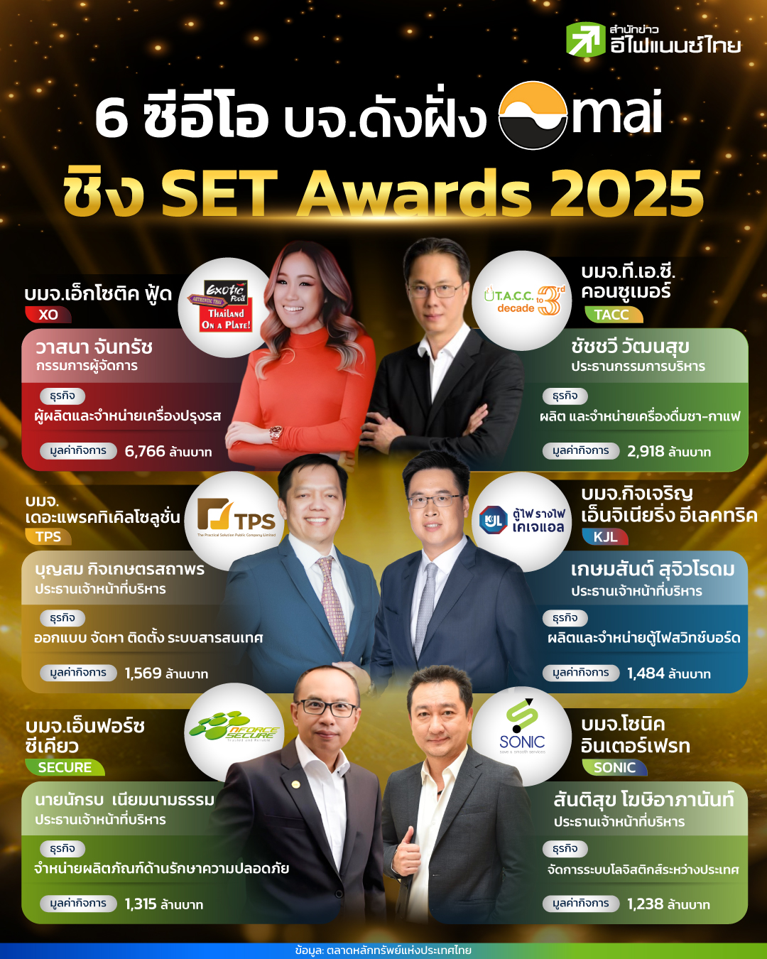 หลังจากที่ “สำนักข่าวอีไฟแนนซ์ไทย ได้ทำการรวบรวม 8 ผู้บริหาร จาก SET เข้าชิงรางวัล CEO Awards แล้ว ครั้งนี้จึงได้ทำการรวบรวม 6 ซีอีโอ บจ.ดัง ฝั่ง mai กันบ้าง ที่มีรายชื่อเข้าชิงรางวัล ที่จะประกาศในวันที่ 30 ต.ค. นี้ โดยรางวัลดังกล่าว จากการที่ตลาดหลักทรัพย์แห่งประเทศไทย (ตลท.) ได้จัดงาน SET Awards ขึ้น โดยเป็นเวทีสำคัญที่จัดขึ้นเป็นประจำทุกปี เพื่อยกย่องเชิดชูบริษัทจดทะเบียน บริษัทหลักทรัพย์ บริษัทหลักทรัพย์จัดการกองทุน บริษัทที่ปรึกษาทางการเงิน ทรัสต์เพื่อการลงทุนในอสังหาริมทรัพย์ และผู้บริหารสูงสุดของบริษัทจดทะเบียน