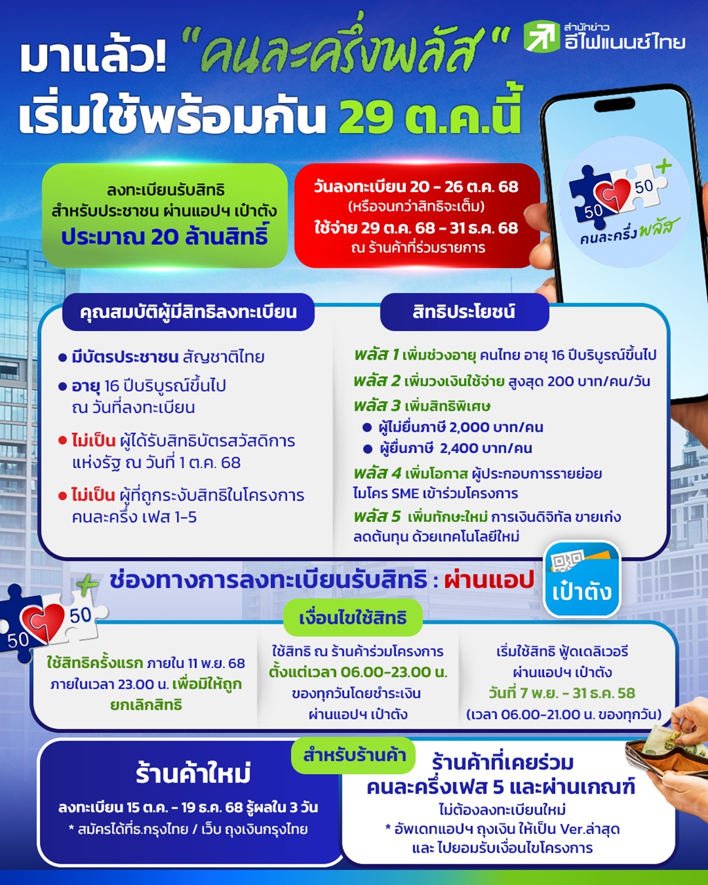 คณะรัฐมนตรี (ครม.) มีมติเห็นชอบโครงการ “คนละครึ่งพลัส” มาตรการกระตุ้นเศรษฐกิจเรือธงของรัฐบาล ที่จะเปิดให้ประชาชนลงทะเบียนระหว่างวันที่ 20 - 26 ตุลาคม 2568 ผ่านแอป “เป๋าตัง” โดยเริ่มใช้สิทธิได้ตั้งแต่วันที่ 29 ตุลาคม - 31 ธันวาคม 2568 ตั้งแต่เวลา 06.00 - 23.00 น.ของทุกวัน โดยนายเอกนิติ นิติทัณฑ์ประภาศ รองนายกรัฐมนตรีและรัฐมนตรีว่าการกระทรวงการคลัง กล่าวว่า “คนละครึ่งพลัส” เป็นหนึ่งในนโยบาย Quick Big Win ที่รัฐบาลมุ่งใช้ฟื้นฟูเศรษฐกิจ ลดรายจ่าย เพิ่มรายได้ และกระตุ้นกำลังซื้อของประชาชน