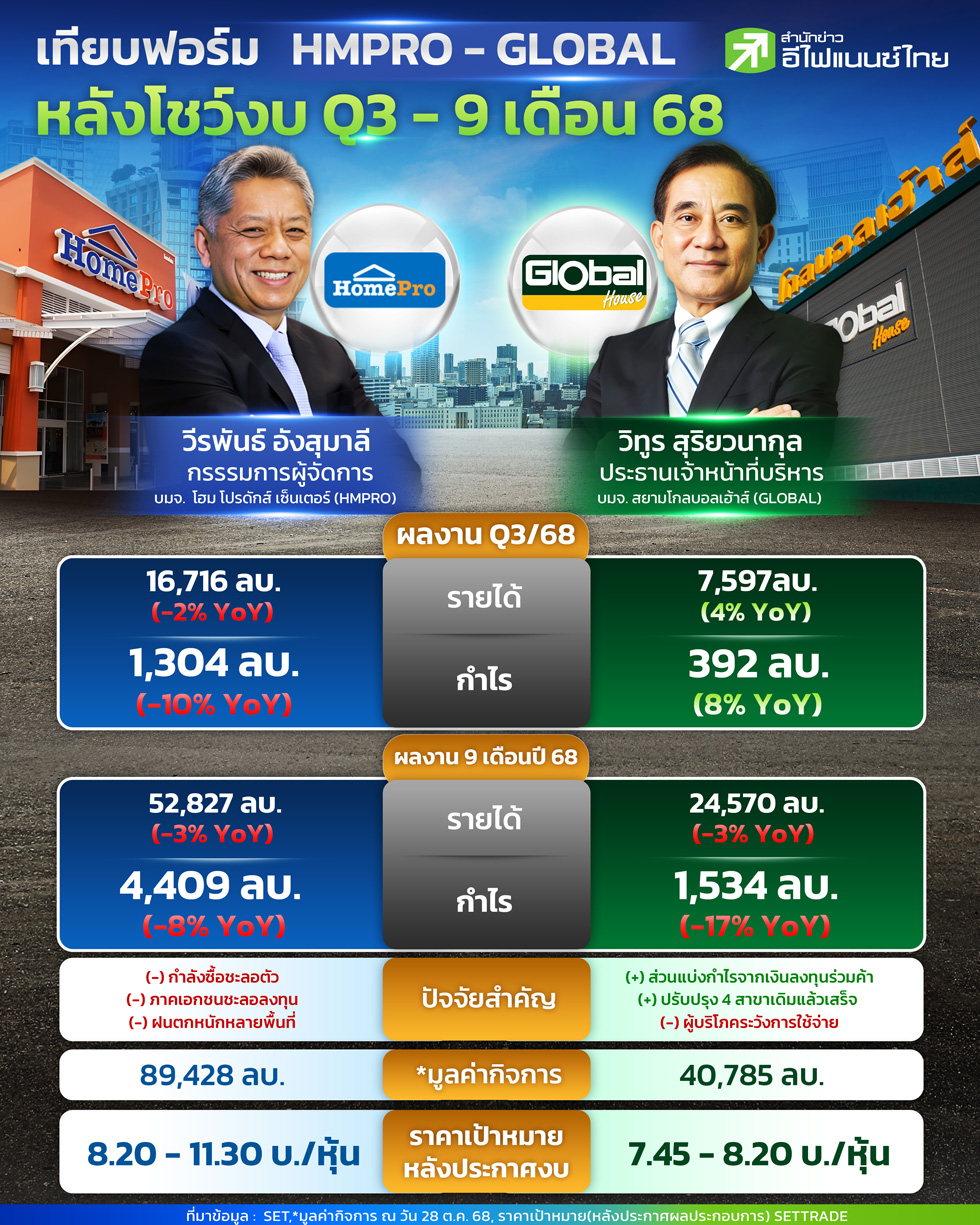 2 หุ้นในกลุ่มค้าปลีกวัสดุก่อสร้างชั้นนำของไทย อย่าง บริษัท โฮม โปรดักส์ เซ็นเตอร์ จำกัด (มหาชน) หรือ HMPRO และ บริษัท สยามโกลบอลเฮ้าส์ จำกัด (มหาชน) หรือ GLOBAL ประกาศผลประกอบการงวด Q3/68 และ 9 เดือนปี 68 ออกมาพร้อมกันโดยมิได้นัดหมาย ซึ่งภาพรวมผลงานของทั้งคู่ ยังเผชิญกับสภาพเศรษฐกิจที่ท้าทาย HMPRO มีกำไรสุทธิ 1,304 ล้านบาท ลดลง 10% จากช่วงเดียวกันของปีก่อน ขณะที่รายได้รวมอยู่ที่ 16,716 ล้านบาท ลดลง 2% ซึ่งมีปัจจัยกดดันจากกำลังซื้อของผู้บริโภคชะลอตัวตามภาวะเศรษฐกิจอย่างต่อเนื่อง ส่งผลให้รายได้จากการขายสินค้าลดลง