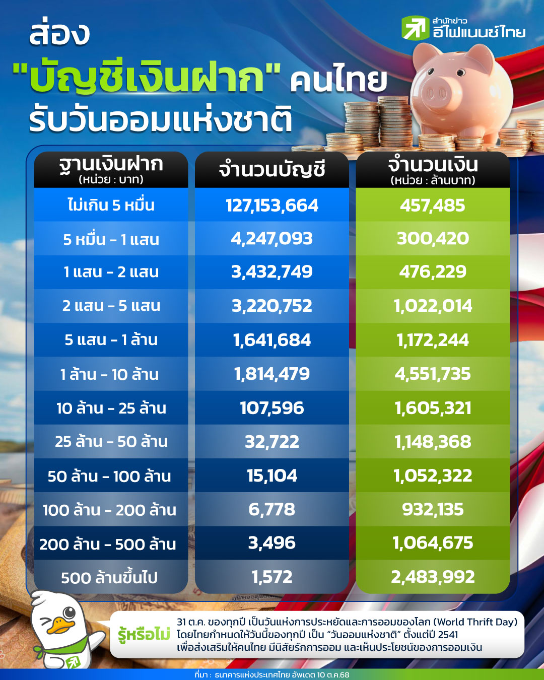 วันออมแห่งชาติ 31 ตุลาคม เวียนมาถึง! สำนักข่าวอีไฟแนนซ์ไทย ชวนสำรวจสถานการณ์ บัญชีเงินฝากของคนไทย ณ 10 ต.ค. (ข้อมูลจาก ธนาคารแห่งประเทศไทย หรือ ธปท.) เพื่อดูว่าคนไทยส่วนใหญ่มีเงินออมอยู่ในระดับใด เตรียมความพร้อมทางการเงินและปลูกฝังนิสัยรักการ ออมเงิน เพื่อความมั่นคงในอนาคต สำหรับวันออมโลก (World Thrift Day) เป็นวันที่นานาประเทศให้ความสำคัญ โดยถือเอาวันสุดท้ายของเดือนตุลาคมของทุกปีเป็นวันสำคัญนี้ กำหนดขึ้นเป็นครั้งแรกเมื่อ พ.ศ. 2467 ณ กรุงมิลาน ประเทศอิตาลี เพื่อกระตุ้นให้ประชาชนเห็นความสำคัญของการ