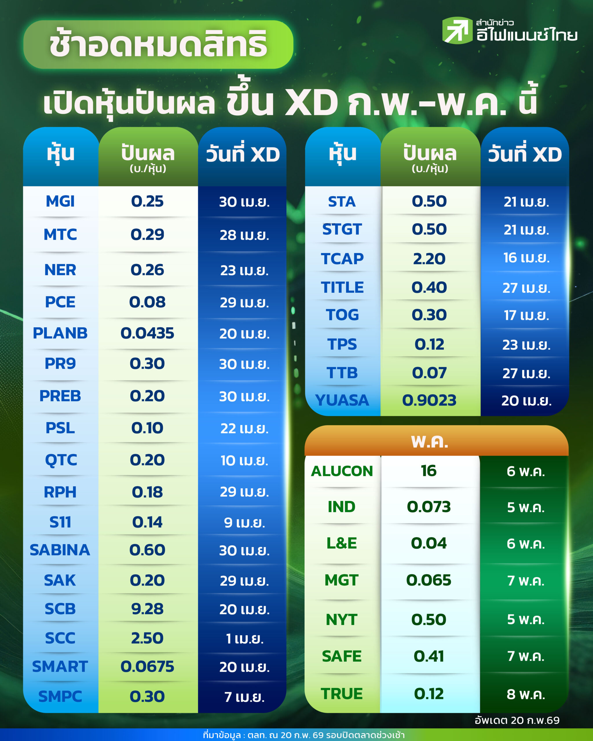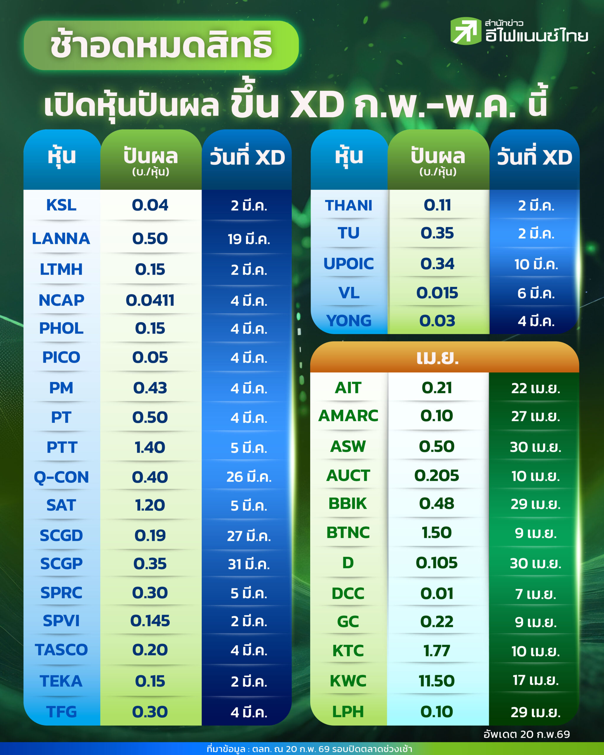 ช้าอดหมดสิทธิ เปิดหุ้นปันผลขึ้น XD ก.พ.–พ.ค. 2569