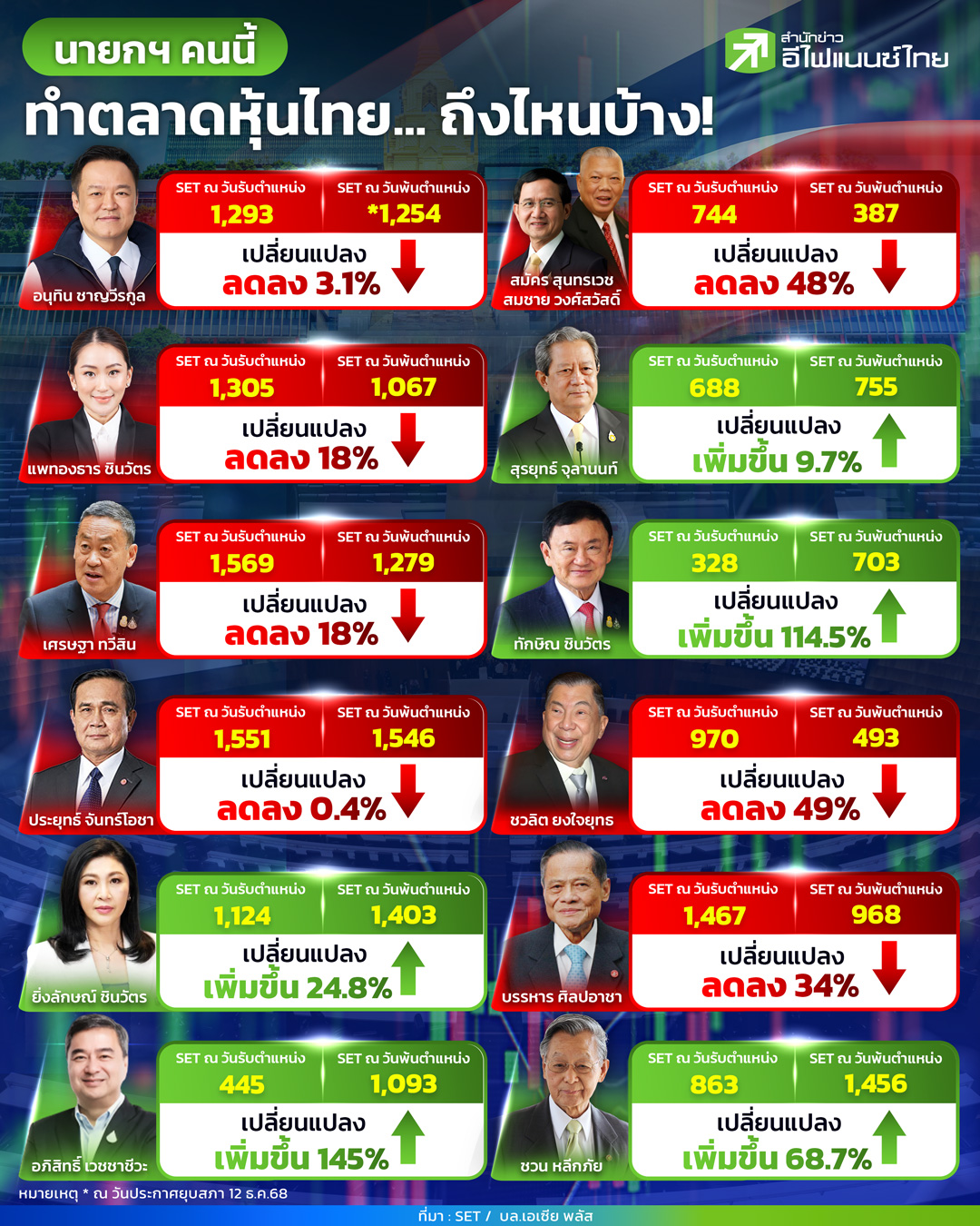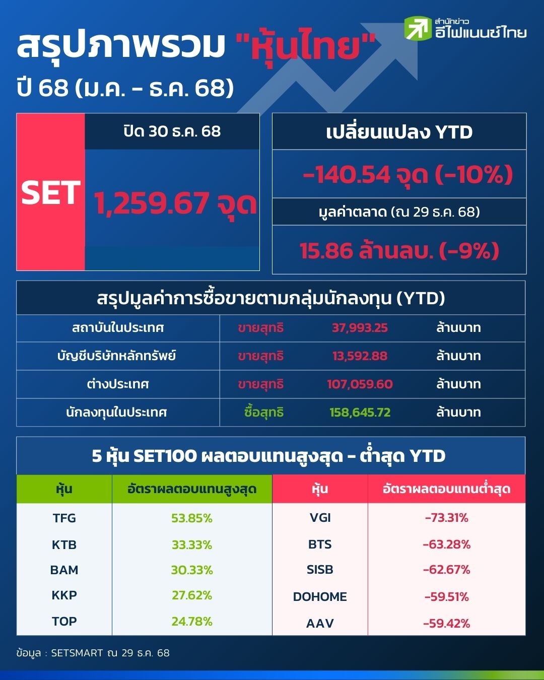 star_borderModal Upgrade Packageสรุปภาพรวมตลาดหุ้นไทยปี 68ตลาดหุ้นไทยในช่วงปี 2568 เจอมรสุมหลายด้าน กดดันให้เศรษฐกิจไทยเติบโตช้ากว่าที่ควรจะเป็น ซึ่งส่งผลให้นักลงทุนไทยต้องติดตามสถานการณ์อย่างใกล้ชิด30 ธ.ค. 2568 17:41 น.