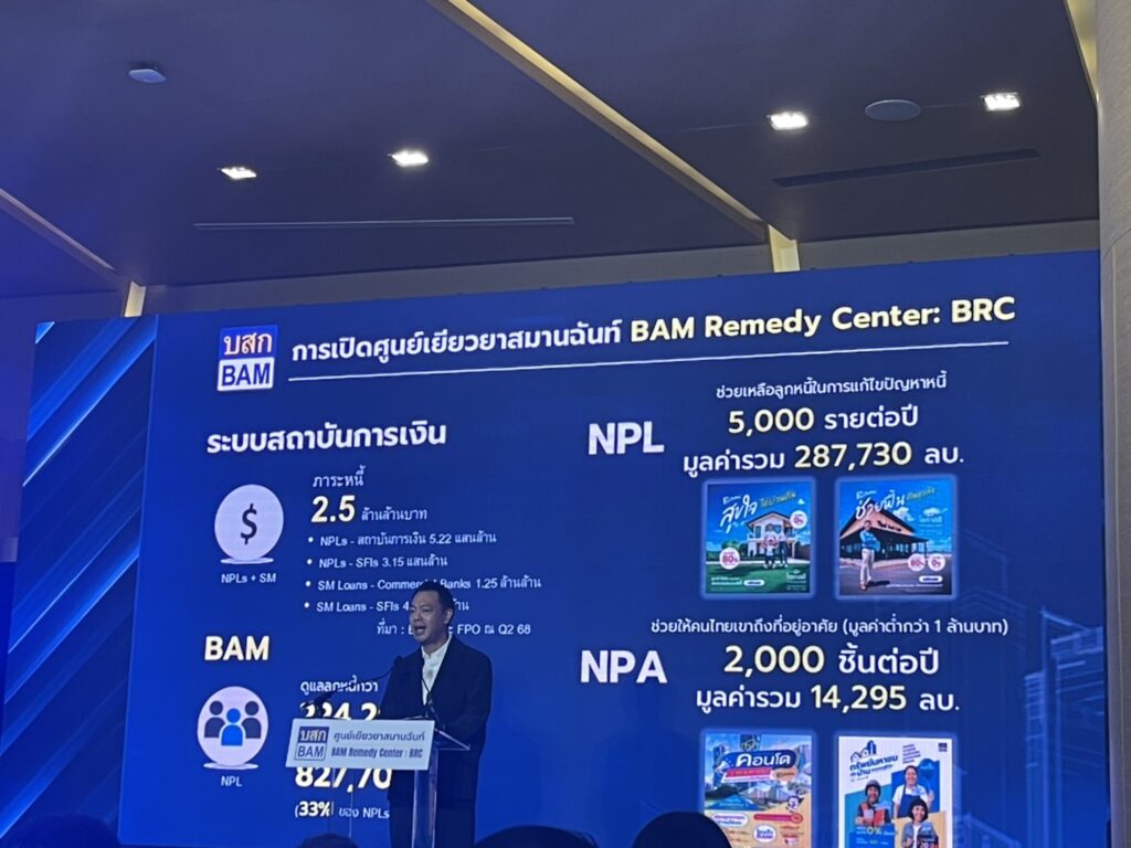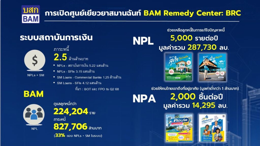 BAM ช่วยลูกหนี้มาแล้วกว่า 164,486 ราย รวมภาระหนี้กว่า 508,790 ล้านบาท โดยเฉพาะลูกหนี้รายย่อยที่มีรายได้ต่ำกว่า 30,000 บาทต่อเดือน มีการปรับโครงสร้างหนี้กว่า 50,000 ราย จึงกลับมาเริ่มต้นใหม่ได้โดยไม่สูญเสียทรัพย์ที่ใช้เป็นหลักประกัน แม้กระทั่งลูกหนี้ที่มีความเสี่ยงบ้านหลุด ได้ช่วยชะลอการบังคับคดีมีทางออกร่วมกันได้กว่า 22,204 รายทั่วประเทศ มูลค่าหนี้ 287,730 ล้านบาท ได้คืนกรรมสิทธิ์ทรัพย์ถึง 14,259 ล้านบาท
