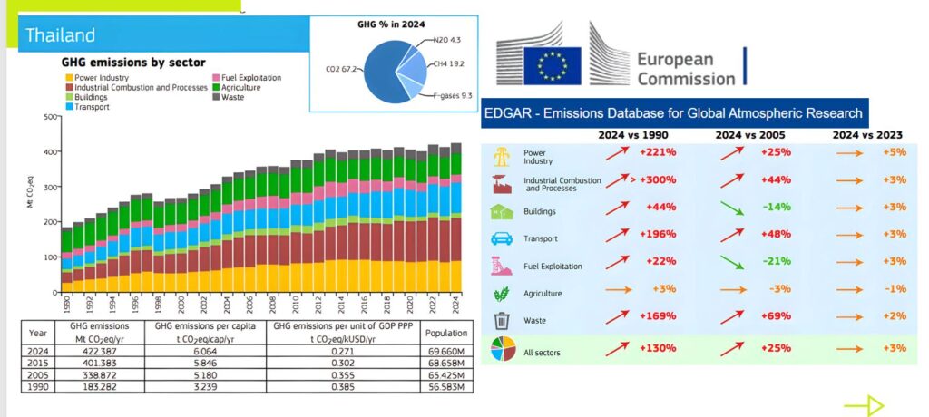 คุณเจสัน ลี ผู้บริหารฝ่ายความยั่งยืน ธนาคาร ซีไอเอ็มบี ไทย เปิดเผยว่า ประเทศไทยกำลังเผชิญกับอุปสรรค (Painpoint) ในการเร่งเปลี่ยนผ่าน ตามเป้าหมายคาร์บอนเป็นศูนย์ ( Net Zero) ที่เลื่อนจากเดิม ปี 2065 ให้เร็วขึ้นมาเป็นปี 2050 เพราะจากข้อมูลการปล่อยก๊าซเรือนกระจกของประเทศไทยจากภาคอุตสาหกรรมโดยรวม ตั้งแต่ปี 1990 จนถึงปี 2024 กลับมีการเพิ่มการปล่อยก๊าซอย่างต่อเนื่อง ไม่สอดคล้องกับทิศทางการเป้าหมาย