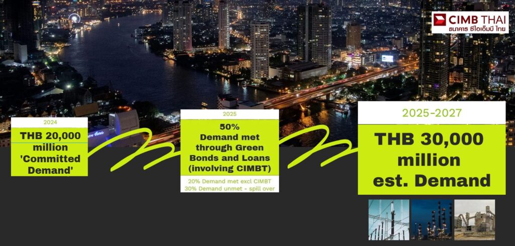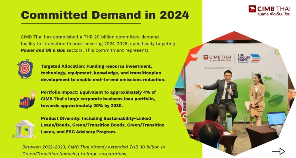 โดยเป้าหมายการสนับสนุนทางการเงินของCIMB Thai เพื่อการเปลี่ยนผ่าน หรือ Transition Finance มีกลุ่มธุรกิจที่ต้องการการสนับสนุนทางการเงิน (Committed Demand) 20,000 ล้านบาทภายใน 2 ปี (พ.ศ. 2567 – พ.ศ.2569) โดยในปัจจุบันกลุ่มลูกค้ามีการระดมทุนผ่านตราสารหนี้และสินเชื่อเป็น 50% แล้ว ตั้งเป้าหมายไว้ที่ 2 หมื่นล้านบาท (ปี 2567–2568) โดยในปีนี้บรรลุเป้าหมายแล้ว 1 หมื่นล้านบาท และเป้าหมายเพิ่มเป็น 3 หมื่นบาท ภายในปี 2570 โดยขยายสัดส่วนสินเชื่อเพื่อESG จาก4% เพิ่มเป็น 20% ภายในปี 2570