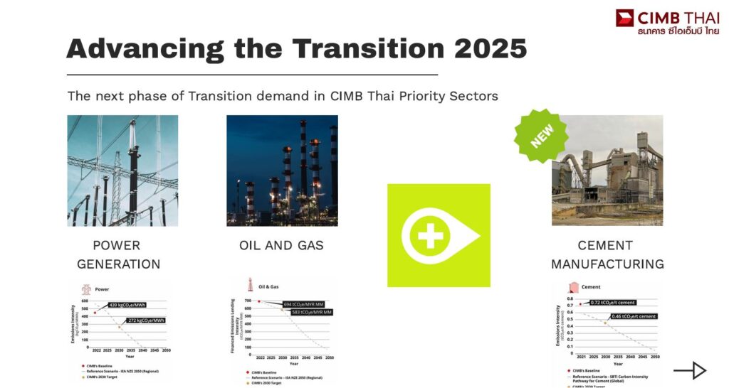 CIMB Thai วางบทบาทตัวเองเป็น “ผู้ช่วยในการเร่งการเปลี่ยนผ่าน” ให้กับ 3 อุตสาหกรรมที่ปล่อยคาร์บอนสูงได้แก่ การผลิตไฟฟ้า น้ำมันและก๊าซ และการผลิตปูนซีเมนต์ ซึ่งเป็นอุตสาหกรรมที่มีการปล่อยคาร์บอนสูง และเป็นอุตสาหกรรม จึงต้องการเงินลงทุนเพื่อพัฒนาเทคโนโลยี ที่ลดการปล่อยคาร์บอนในกระบวนการผลิต