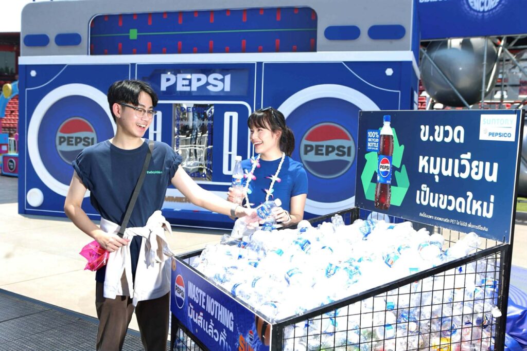 นางสาววิภาวรรณ ทัศนปรีชาชัย รองประธานบริหารฝ่ายบรรษัทสัมพันธ์ บริษัท ซันโทรี่ เป๊ปซี่โค เบเวอเรจ (ประเทศไทย) จำกัด กล่าวเสริมว่า ซันโทรี่ เป๊ปซี่โค ประเทศไทย มีแนวคิดว่าบรรจุภัณฑ์ใช้แล้วไม่ควรถูกทิ้งเป็นขยะ แต่ควรเป็นทรัพยากรที่สามารถหมุนเวียนกลับมาใช้ใหม่ได้ เราจึงส่งเสริมการจัดการบรรจุภัณฑ์อย่างยั่งยืน โดยขับเคลื่อนแคมเปญ ‘Waste Nothing – มันส์ แล้ว ทิ้ง’ อย่างต่อเนื่อง ผ่านเทศกาลดนตรีและกิจกรรมที่แบรนด์เป๊ปซี่สนับสนุน (Event-Based Packaging Sustainability) เพื่อเปิดโอกาสให้ผู้บริโภคมีส่วนร่วมในการคัดแยกขยะด้วยตนเองและส่งต่อบรรจุภัณฑ์ใช้แล้วกลับเข้าสู่กระบวนการรีไซเคิล
