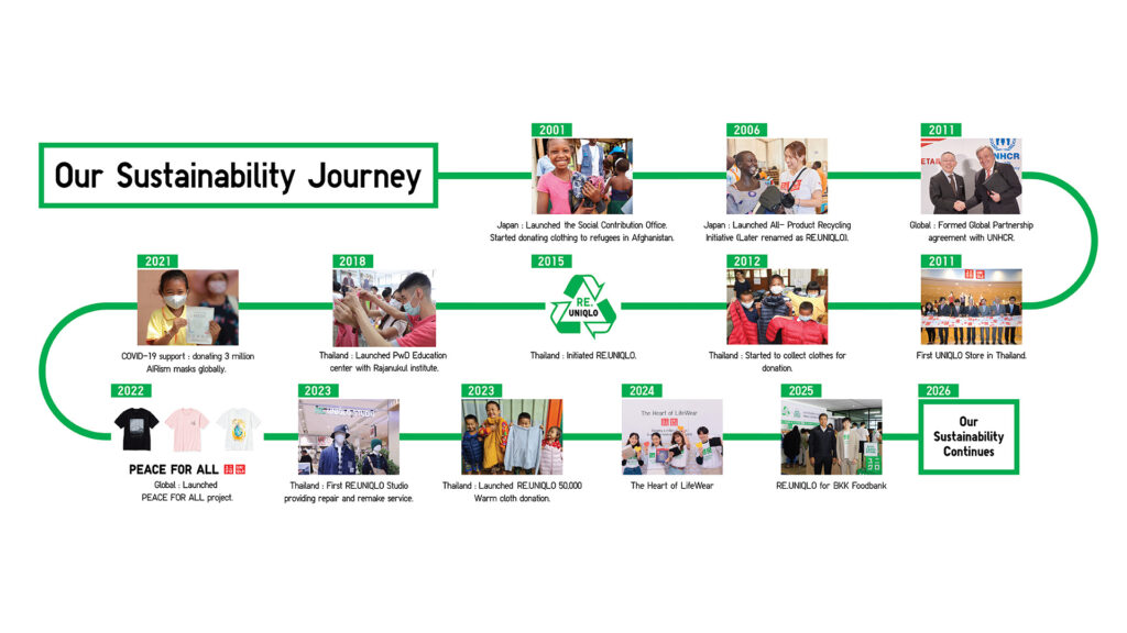 นอกจากนี้ ยูนิโคล่ ประเทศไทย ยังริเริ่มโครงการด้านความยั่งยืนต่างๆ ที่ตอบสนองกับสังคมไทยโดยเฉพาะ ผ่านการร่วมมือกับทั้งภาครัฐและภาคเอกชน เรายังคงมุ่งมั่นเดินหน้าสานต่อโครงการและกิจกรรมด้านความยั่งยืนอย่างต่อเนื่อง เพื่อเป้าหมายในการยกระดับคุณภาพชีวิตของคนไทยและสังคมไทย”