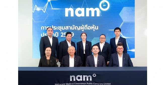 สำนักข่าวอีไฟแนนซ์ไทย- -28 เม.ย. 69 15:55 น. พลเอกวินัย ภัททิยกุล (แถวนั่งที่ 2 จากซ้าย) ประธานกรรมการ, คุณวิโรจน์ ชัยเทอดเกียรติ (แถวนั่งที่ 2 จากขวา) ประธานเจ้าหน้าที่บริหาร และคุณสุขุม โพธิสวัสดิ์ (แถวนั่งขวาสุด) ประธานเจ้าหน้าที่สายงานบัญชีและการเงิน พร้อมด้วยคณะกรรมการ บริษัท นำวิวัฒน์ เมดิคอล คอร์ปอเรชั่น จำกัด (มหาชน) (NAM) ถ่ายภาพร่วมกันภายหลังการประชุมสามัญผู้ถือหุ้นประจำปี 2569 ในรูปแบบการประชุมผ่านสื่ออิเล็กทรอนิกส์ (e-Meeting) โดยที่ประชุมมีมติอนุมัติเห็นชอบทุกวาระตามที่คณะกรรมการเสนอ รวมทั้งอนุมัติจ่ายเงินปันผลจากผลประกอบการปี 2568 ในอัตราหุ้นละ 0.03 บาท โดยกำหนดจ่ายในวันที่ 15 พฤษภาคม 2569 ซึ่งงานดังกล่าวจัดขึ้น ณ ห้องประชุม บมจ.นำวิวัฒน์ สำนักงานใหญ่ เมื่อเร็วๆ นี้