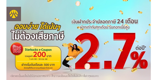 ออมง่าย ได้เน้นๆ ไม่ต้องเสียภาษี กับเงินฝากประจำปลอดภาษี 24 เดือน รับอัตราดอกเบี้ย 2.7% ต่อปี