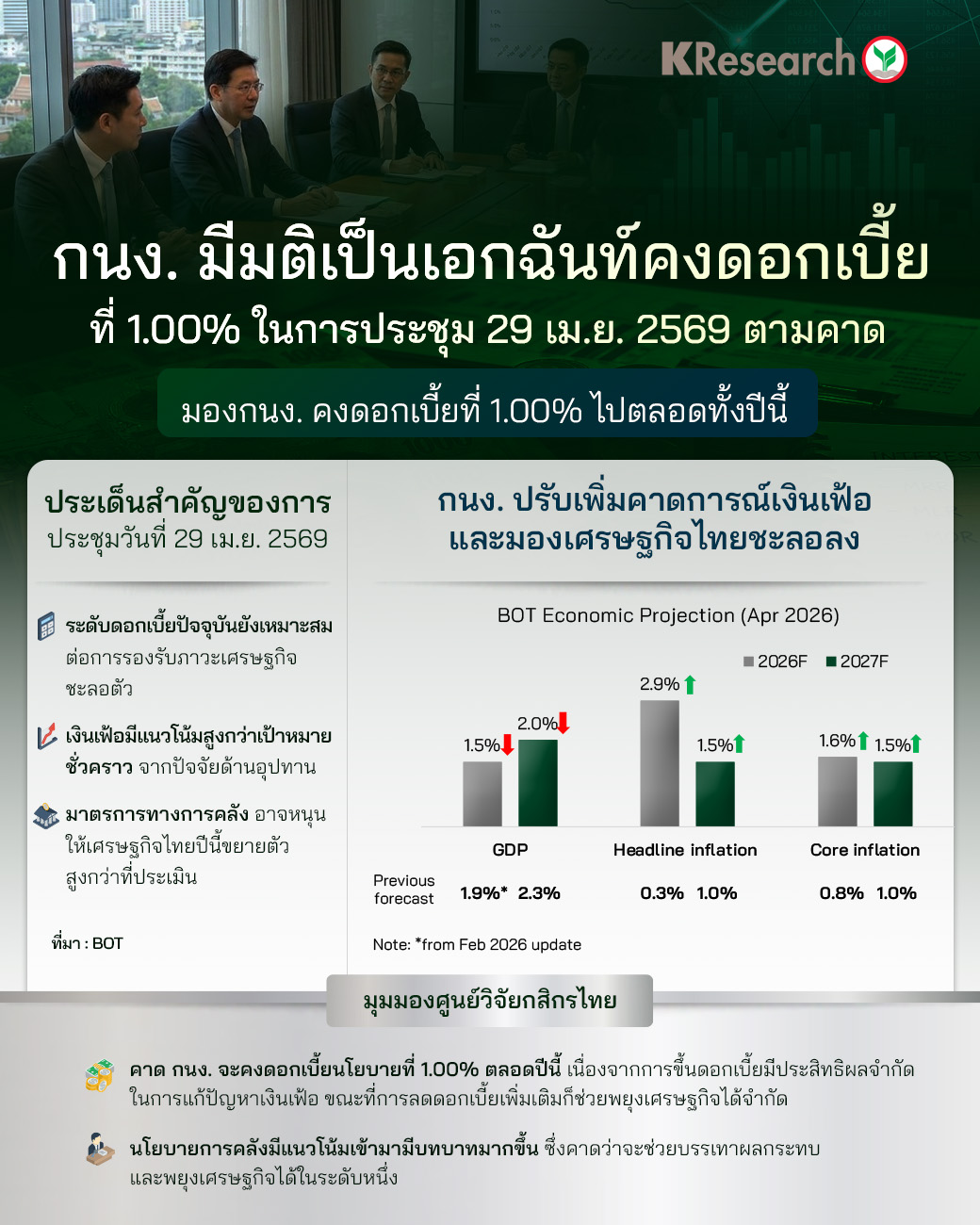 สำนักข่าวอีไฟแนนซ์ไทย- -29 เม.ย. 69 17:12 น. ศูนย์วิจัยกสิกรไทย มอง กนง.คงดอกเบี้ย 1.00% เพื่อรับมือเศรษฐกิจชะลอตัว แม้เงินเฟ้อสูงชั่วคราว พร้อมคาดทั้งปี 69 ยังตรึงดอกเบี้ยต่อ และให้นโยบายการคลังเข้ามาช่วยพยุงเศรษฐกิจมากขึ้น ศูนย์วิจัยกสิกรไทย เปิดเผยถึง กรณีผลการประชุมคณะกรรมการนโยบายการเงิน (กนง.) มีมติเป็นเอกฉันท์คงดอกเบี้ย ที่ 1.00% ในการประชุม 29 เม.ย. ตามคาด โดยมองระดับดอกเบี้ยปัจจุบันยังเหมาะสมต่อการรองรับภาวะเศรษฐกิจชะลอตัว ขณะที่เงินเฟ้อมีแนวโน้มสูงกว่าเป้าหมายชั่วคราวจากปัจจัยด้านอุปทาน ทั้งนี้ศูนย์วิจัยกสิกรไทย คาด กนง. จะคงดอกเบี้ยนโยบายที่ 1.00% ตลอดปีนี้ เนื่องจากการขึ้นดอกเบี้ยมีประสิทธิผลจำกัดในการแก้ปัญหาเงินเฟ้อ ขณะที่การลดดอกเบี้ยเพิ่มเติมก็ช่วยพยุงเศรษฐกิจได้จำกัด นอกจากนี้ นโยบายการคลังมีแนวโน้มเข้ามามีบทบาทมากขึ้น ซึ่งคาดว่าจะช่วยบรรเทาผลกระทบและพยุงเศรษฐกิจได้ในระดับหนึ่ง