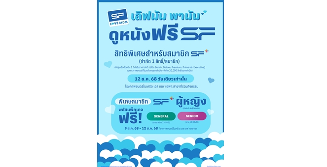 สำนักข่าวอีไฟแนนซ์ไทย- -11 ส.ค. 68 12:29 น. โรงภาพยนตร์ในเครือ เอส เอฟ ต้อนรับ “วันแม่แห่งชาติปี 2568” มอบสิทธิพิเศษ สำหรับสมาชิก SF+ เมื่อซื้อบัตรชมภาพยนตร์ 1 ที่ รับสิทธิ์พาคุณแม่ชมภาพยนตร์ด้วยกันฟรี 1 ที่นั่ง จำนวน 20,000 สิทธิ์ สำหรับภาพยนตร์ที่ร่วมรายการ (เฉพาะที่นั่ง Deluxe Seat, Premium Seat, Prime Seat สำหรับโรงภาพยนตร์ในเครือ เอส เอฟ ทุกสาขาทั่วประเทศ และที่นั่ง Executive Seat สำหรับสาขาเอ็มพรีเว่ ซีเนคลับ) สำหรับภาพยนตร์ที่ร่วมรายการ ในวันที่ 12 สิงหาคม 2568 ที่โรงภาพยนตร์ในเครือ เอส เอฟ