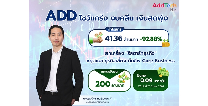 star_borderModal Upgrade PackageADD โชว์สถานะแกร่ง งบคลีน เงินสดพุ่ง เสิร์ฟปันผล 0.09 บาทต่อหุ้น พร้อม XD 17 มี.ค. นี้ ประกาศ `รีสตาร์ทธุรกิจ` หยุดแบกธุรกิจเสี่ยง คืนชีพ Core Business10 Mar 2026 14:42