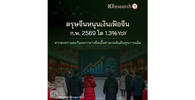 star_borderModal Upgrade Packageศูนย์วิจัยกสิกรฯ เผยตรุษจีนหนุนเงินเฟ้อจีน ก.พ.69 โต 1.3%YoY หากสงครามตะวันออกกลางยืดเยื้อคาดกดดันต้นทุนการผลิต10 มี.ค. 2569 11:44 น.