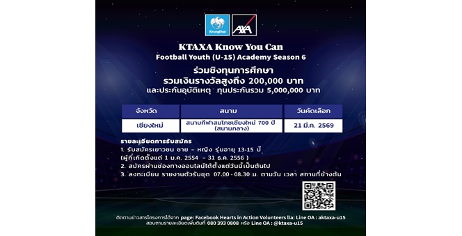 star_borderModal Upgrade Packageกรุงไทย-แอกซ่า ประกันชีวิต เปิดรับสมัครเยาวชนภาคเหนืออายุ 13-15 ปี ร่วมโครงการ KTAXA Know You Can Football Youth (U-15) Academy Season 6 ณ สนามกีฬาสมโภชเชียงใหม่ 700 ปี(สนามกลาง)6 มี.ค. 2569 14:48 น.