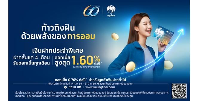 กรุงไทยฉลองครบรอบ 60 ปี เปิดตัวผลิตภัณฑ์เงินฝากประจำพิเศษ 4 เดือน ดอกเบี้ยสูงสุด 1.60% ต่อปี