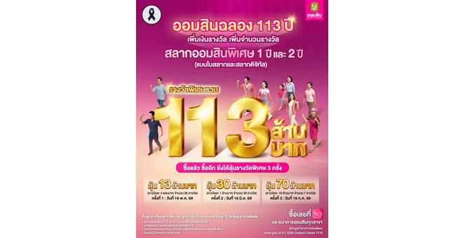 star_borderModal Upgrade Packageออมสิน ฉลอง 113 ปี เพิ่มจำนวนรางวัล เพิ่มเงินรางวัล รวม 113 ล้านบาท ให้ลูกค้าสลากออมสินได้ลุ้นโชคถึง 3 ครั้ง ยิ่งซื้อยิ่งได้ลุ้น จับรางวัลครั้งแรก 16 พ.ค.30 มี.ค. 2569 10:41 น.
