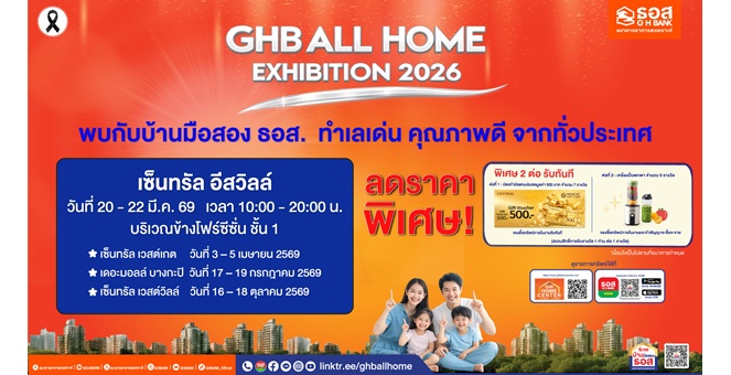 • ธอส. รุกตลาดอสังหาฯ ปี 2569 จัดโรดโชว์ “GHB ALL HOME EXHIBITION 2026” คัดบ้านมือสองคุณภาพดี พร้อมโปรแรงส่งตรงถึงประชาชน