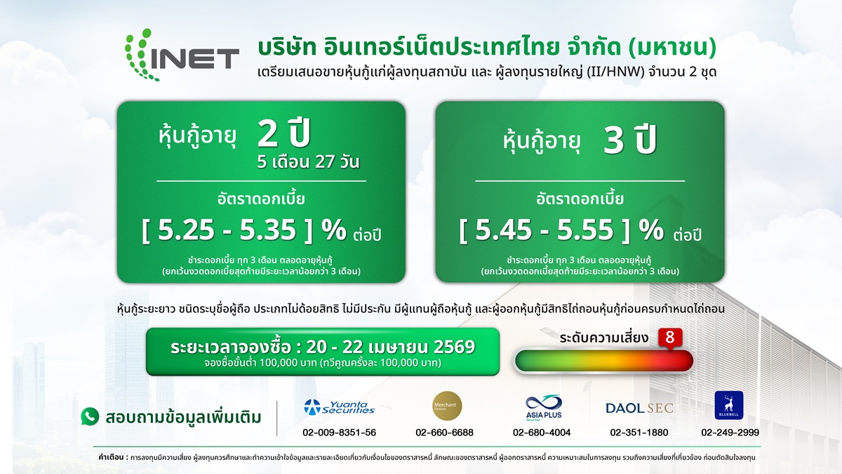 star_borderModal Upgrade PackageINET เตรียมเสิร์ฟหุ้นกู้ 2 ชุด ดอกเบี้ยคงที่ [5.25 - 5.55] % ต่อปี18 Mar 2026 17:25