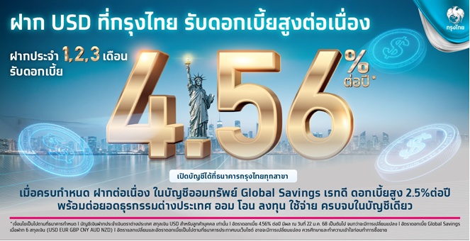 star_borderModal Upgrade Packageกรุงไทยเอาใจลูกค้าฝากประจำ USD รับดอกเบี้ยสูงต่อเนื่อง พร้อมต่อยอดธุรกรรมต่างประเทศได้หลากหลายในบัญชีเดียว16 เม.ย. 2568 09:17 น.