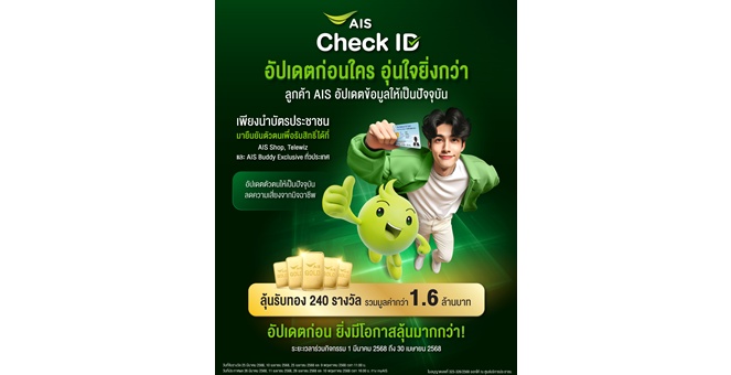 star_borderModal Upgrade PackageAIS ชวนลูกค้ายืนยันตัวตนที่ AIS Shop และจุดบริการทั่วประเทศ เสริมความปลอดภัย อุ่นใจยิ่งกว่า พร้อมลุ้นทองคำกว่า 1.6 ล้านบาท7 มี.ค. 2568 10:27 น.