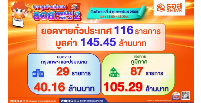 star_borderModal Upgrade Packageธอส. เผยผลการประมูลบ้านมือสองออนไลน์ ครั้งที่ 2/2568 ประจำเดือนกุมภาพันธ์ 2568 สามารถจำหน่ายได้ 116 รายการ มูลค่ารวมกว่า 145.45 ล้านบาท7 ก.พ. 2568 15:51 น.