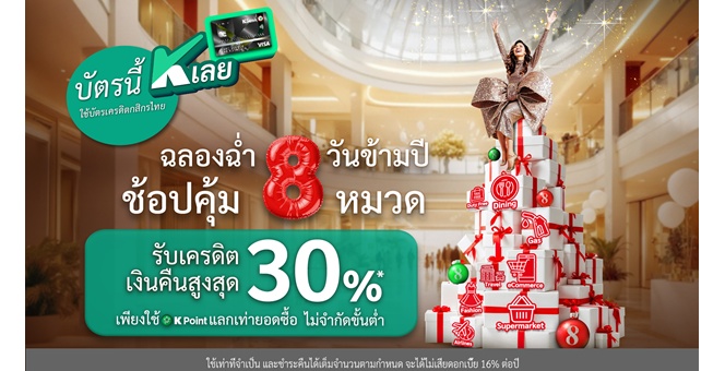 star_borderModal Upgrade Packageบัตรเครดิตกสิกรไทย จัดโปรซูเปอร์คุ้ม “ฉลองฉ่ำ 8 วันข้ามปี ช้อปคุ้ม 8 หมวด” แลกรับเครดิตเงินคืนสูงสุด 30%* เริ่ม 25 ธ.ค. 67 – 1 ม.ค. 6823 Dec 2024 13:59