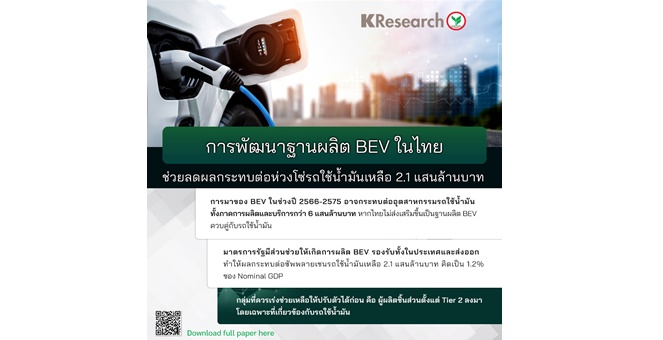 star_borderModal Upgrade PackageModal Upgrade Packageศูนย์วิจัยกสิกรฯ คาดการพัฒนาฐานผลิต BEV ในไทย ช่วยลดผลกระทบต่อห่วงโซ่รถใช้น้ำมันเหลือ 2.1 แสนล้านบาท ในระยะ 10 ปี23 เม.ย. 2567 14:51 น.