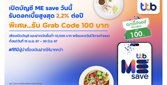 ทีทีบี ชวนออมง่ายได้มากกว่ากับบัญชี ME save รับดอกเบี้ยสูงสุด 2.2% ตั้งแต่บาทแรก รับเพิ่ม Grab Code 100 บาท