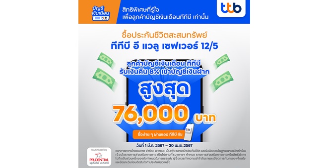 ทีเอ็มบีธนชาต จัดโปรโมชันมอบสิทธิพิเศษเพื่อลูกค้าบัญชีเงินเดือน ทีทีบี รับเงินคืน 8% เพียงชำระค่าเบี้ย “ประกันชีวิตสะสมทรัพย์ ทีทีบี อี แวลู เซฟเวอร์ 12/5” ผ่านแอป ทีทีบี ทัช