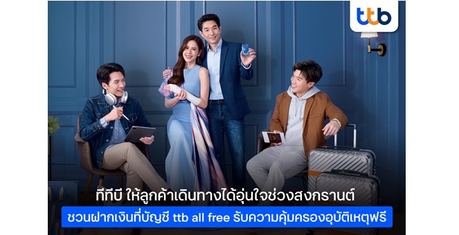 • ทีทีบี เพิ่มความอุ่นใจช่วงสงกรานต์ ฝากเงินบัญชี ttb all free รับความคุ้มครองอุบัติเหตุฟรี เผยปีที่ผ่านมามอบความคุ้มครองให้ลูกค้าแล้วกว่า 2.2 ล้านราย