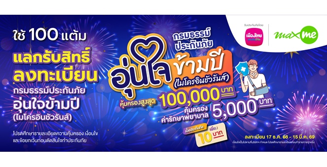 star_borderModal Upgrade PackageModal Upgrade Packageเมืองไทยประกันชีวิต จับมือ แมกซ์ โซลูชัน เซอร์วิส เพิ่มความอุ่นใจแก่สมาชิก Max Card ต้อนรับเทศกาลปีใหม่ ผ่าน “กรมธรรม์ประกันภัยอุ่นใจข้ามปี (ไมโครอินชัวรันส์)”25 ธ.ค. 2568 13:53 น.