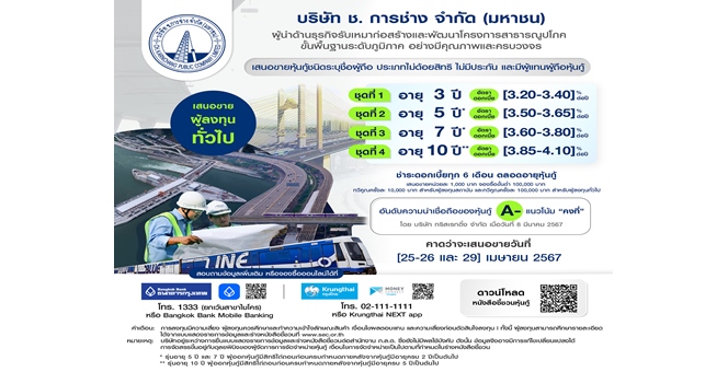 star_borderModal Upgrade PackageModal Upgrade Packageช.การช่าง เตรียมออกหุ้นกู้ 4 ชุด อายุ 3 - 10 ปี ดอกเบี้ย 3.20 – 4.10% ต่อปี อันดับความน่าเชื่อถือระดับ A- สะท้อนโอกาสธุรกิจรับเหมาก่อสร้างที่มีแนวโน้มเติบโตแข็งแกร่ง เสนอขายให้แก่ผู้ลงทุนทั่วไป (Public Offering) คาดเปิดให้จองซื้อปลายเดือน เม.ย. 256719 มี.ค. 2567 10:14 น.