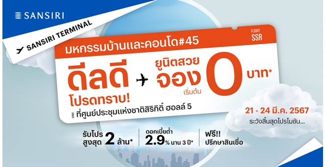 star_borderModal Upgrade PackageModal Upgrade Packageแสนสิริ ทำถึง! ส่งโปรฯ “แสนสิริ เทอร์มินัล ดีลดี โปรดทราบ” ขนบ้าน-ทาวน์โฮม-คอนโด 74 โครงการ พบกันที่งานมหกรรมบ้านและคอนโด ดีลดี มีเฉพาะงานนี้เท่านั้น11 มี.ค. 2567 10:42 น.