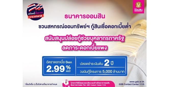 • ออมสิน ชวนสหกรณ์ออมทรัพย์ฯ กู้สินเชื่อดอกเบี้ยต่ำ สนับสนุนปล่อยกู้ช่วยบุคลากรภาครัฐ ตั้งเป้ารวมหนี้ลดภาระดอกเบี้ยแพง ขานรับนโยบายรัฐแก้ไขหนี้ทั้งระบบ