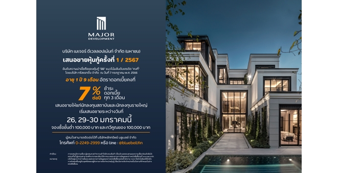 star_borderModal Upgrade PackageModal Upgrade Packageเมเจอร์ ดีเวลลอปเม้นท์ พร้อมนำเสนอขายหุ้นกู้ชุดใหม่ ระดับ BB อายุ 1 ปี 9 เดือน ชูดอกเบี้ย 7.00% ต่อปี จ่ายทุก 3 เดือน24 ม.ค. 2567 15:22 น.