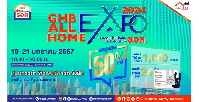 • ธอส. ช่วยคนไทยมีบ้าน กับงาน GHB ALL HOME EXPO 2024 @ฟิวเจอร์พาร์ค รังสิต พบทรัพย์เด่นกว่า 1,000 รายการ ลดสูงสุด 50% ราคาต่ำสุดเพียง 45,000 บาท เท่านั้น!!