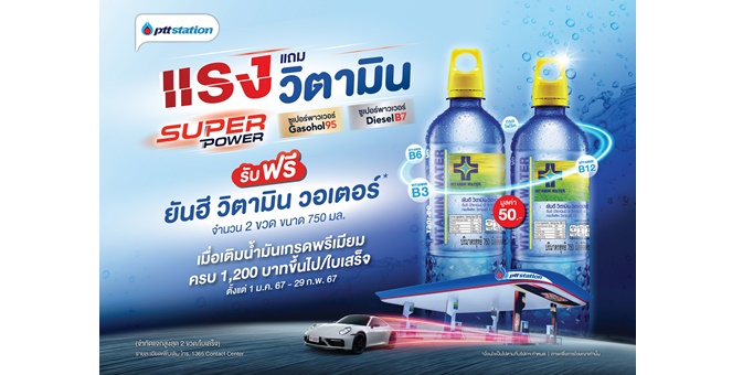 พีทีที สเตชั่น จัดโปร “แรงแถมวิตามิน” เติมน้ำมันเกรดพรีเมียม Super Power ครบ 1,200 บาทขึ้นไป/ใบเสร็จ รับฟรี ยันฮี วิตามิน วอเตอร์ จำนวน 2 ขวด มูลค่า 50 บาท