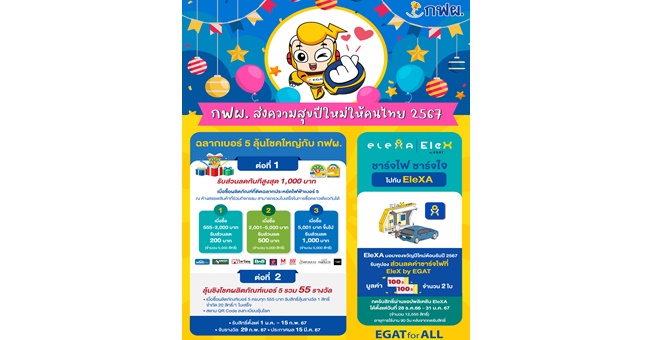 • ส่งมอบความสุข 2567 กับ 55 ปี กฟผ. ด้วยผลิตภัณฑ์เบอร์ 5 และส่วนลดชาร์จรถ EV