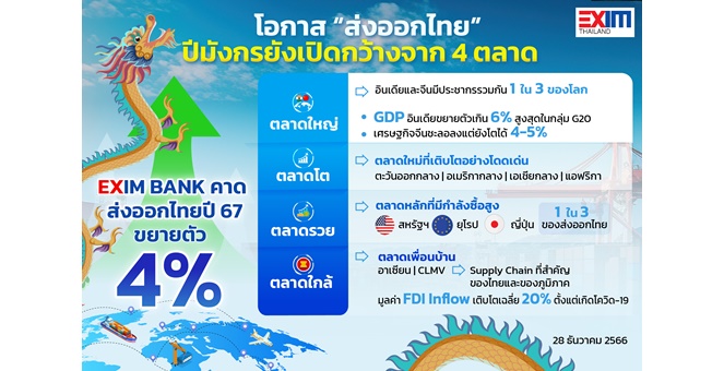 • EXIM BANK ชี้โอกาส “ตลาดส่งออก” ปีมังกรยังเปิดกว้าง จากทิศทางการค้าโลกที่ฟื้นตัว หนุนการส่งออกไทยปี 2567 ขยายตัว 4%