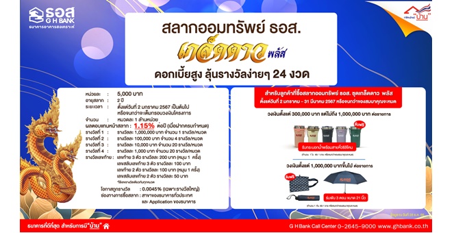 • ธอส. มอบโชครับปีมังกรทอง กับสลากออมทรัพย์ ธอส. ชุดเกล็ดดาว พลัส ผลตอบแทนหน้าสลากสูงถึง 1.15% ต่อปี ลุ้นรางวัลง่ายๆ 24 งวด